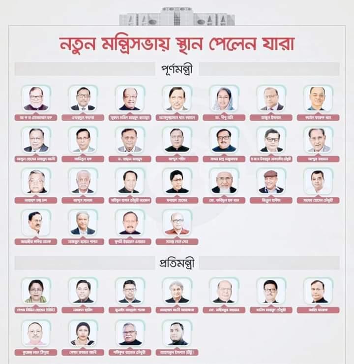গণপ্রজাতন্ত্রী বাংলাদেশ সরকারের নতুন মন্ত্রিসভায় ৩৬ জন ঠাঁই পাচ্ছেন। এর মধ্যে ২৫ জন পূর্ণ মন্ত্রী এবং ১১ জন প্রতিমন্ত্রী হচ্ছেন। আজ বুধবার রাতে মন্ত্রিপরিষদ সচিব মাহবুব হোসেন নতুন মন্ত্রী প্রতিমন্ত্রীদের তালিকা সাংবাদিকদের জানান। আগামীকাল বৃহস্পতিবার সন্ধ্যায় প্রধানমন্ত্রীর নেতৃত্বে নতুন মন্ত্রিসভা শপথ নেবেন বলে জানা যায়। এবিষয়ে আরো জানা যায় যে