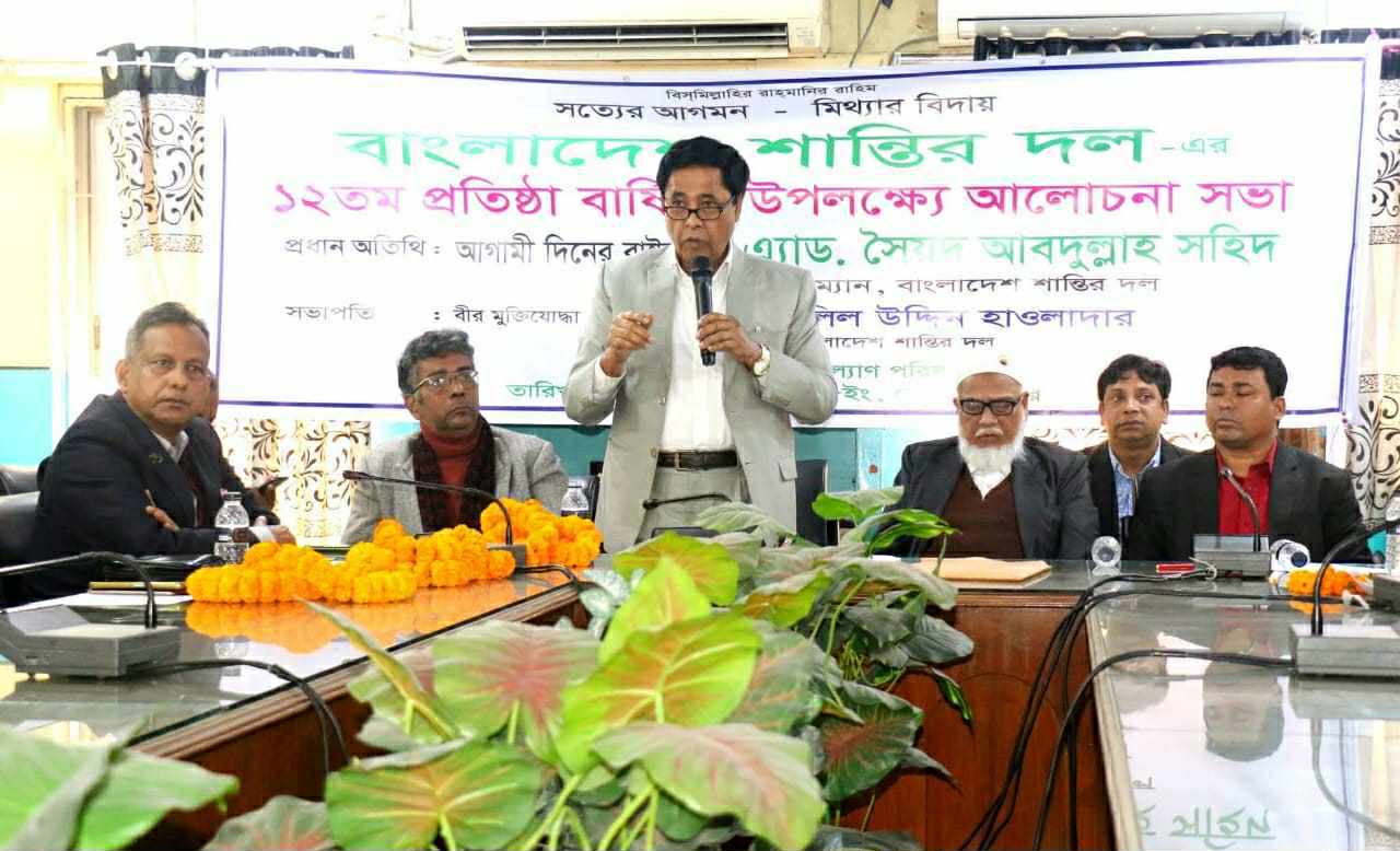 উক্ত আলোচনা সভায় প্রধান অতিথির বক্তব্যে শান্তির দলের চেয়ারম্যান অ্যাডভোকেট সৈয়দ আব্দুল্লাহ সহিদ বলেন যে, স্বাধীনতার ৫৪ বছর অতিক্রান্ত হলেও বাংলাদেশ আজও একটি মানসম্মত গণতান্ত্রিক দেশে পরিণত হয়নি এবং বাংলাদেশে আজও দলীয় সরকারের অধীনে একবারের জন্য কখনো সরকারী দল ব্যতীত বিরোধী কোনো দল নির্বাচিত হয়ে সরকার গঠন করতে পারেনি এবং অবশেষে এরূপ প্রত্যেকটি সরকার ভোটের মাধ্যমে নয় বরং আন্দোলনের মাধ্যমে পতন হয়েছে। কিন্তু আজও জাতি গণতান্ত্রিক সংগ্রামের প্রাথমিক স্তরের বিজয় অর্জণ করতে পারেনি। সর্বশেষ আওয়ামী লীগ সরকার প্রায় বিনাভোটে গায়ের জোরে সরকার গঠন করে স্বৈরাচারী একনায়কতান্ত্রিক শাসন ব্যবস্থা কায়েম করে। এইভাবে গণতন্ত্রহীনতা ও সুশাসন ও সুবিচারের অভাবে সকল দলের রাজনৈতিক সরকার শাসন পরিচালনায় দেশে সীমাহীন দূর্নীতি হয়েছে। ফলে এই দেশ বিশ্বে পর পর পাঁচবার দূর্নীতিতে চ্যাম্পিয়ন হয় এবং আজও পৃথিবীর প্রথম ১৩তম দূর্নীতিগ্রস্ত দেশ হিসেবে বিবেচিত হচ্ছে। এটা আমাদের জন্য অত্যন্ত দুঃখজনক, লজ্জাজনক ও একেবারেই অগ্রহণযোগ্য।